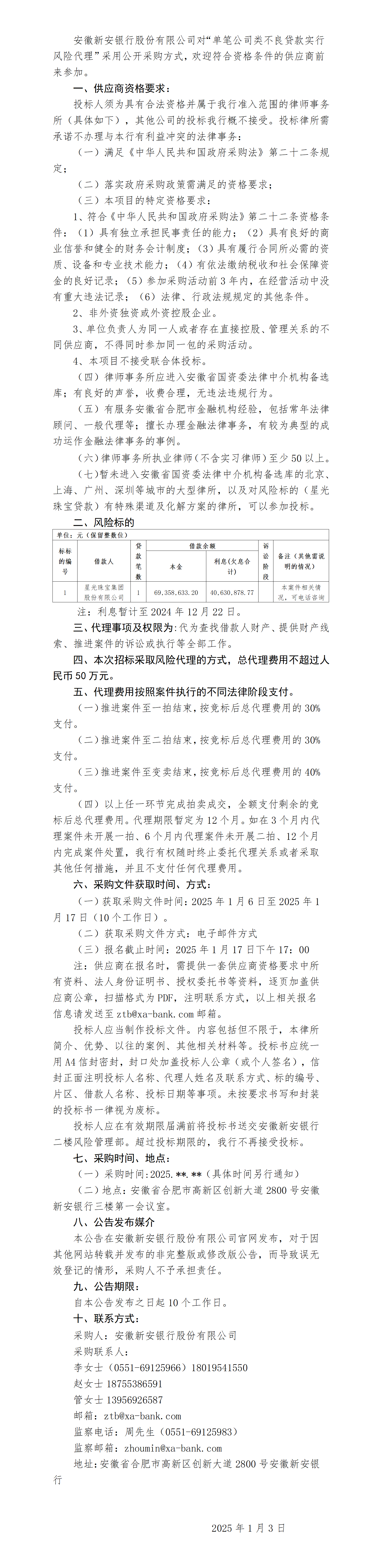 安徽新安银行风险代理项目公告